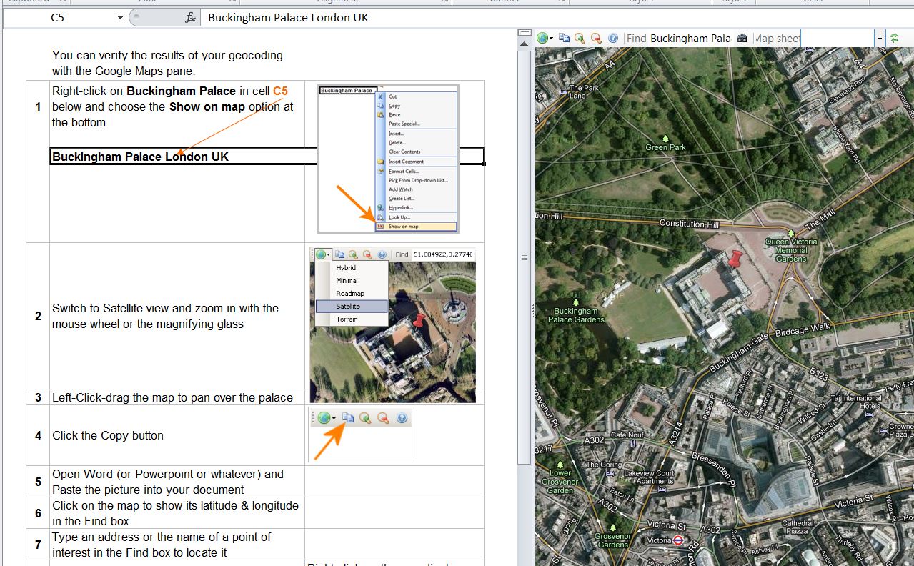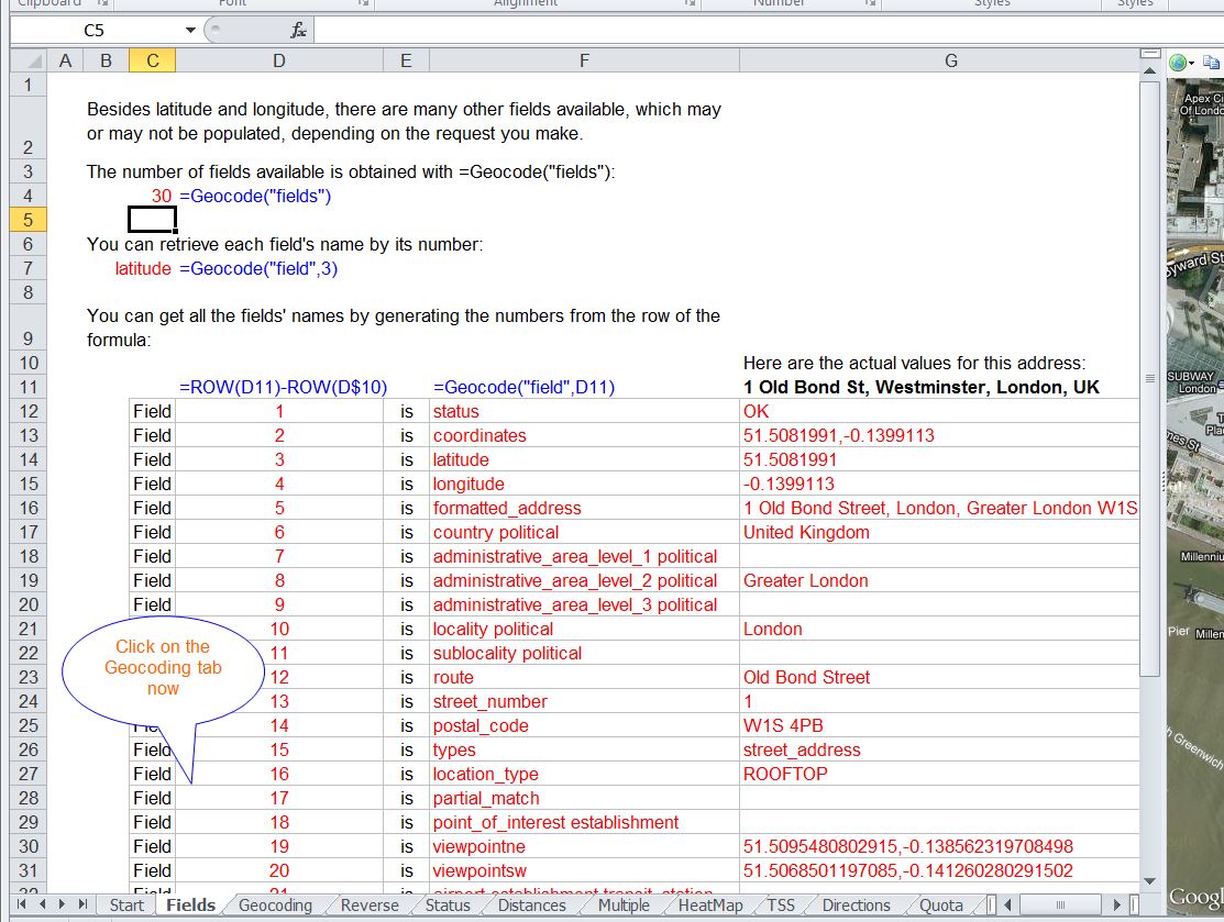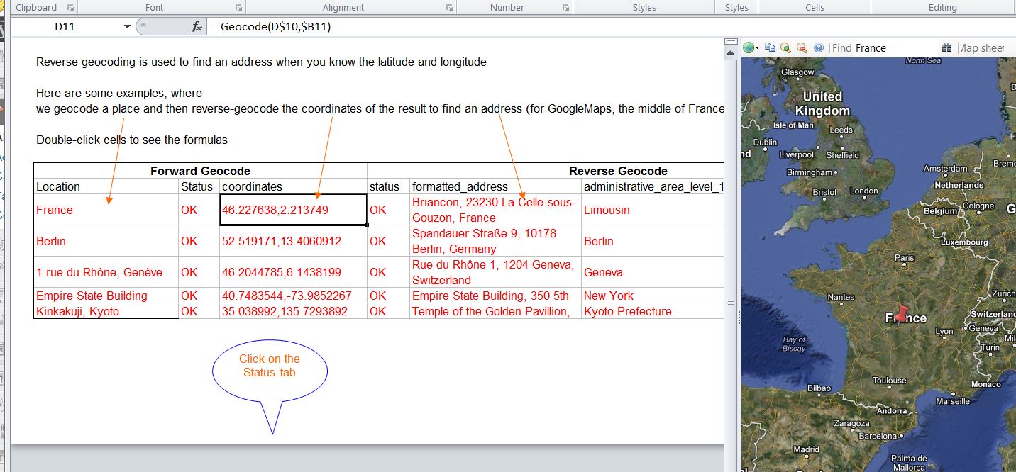 GeodesiX is is an addin for Microsoft Excel which allows you to display maps, perform forward and reverse geocoding, compute distances (Great Circle, driving, bicycling and walking) and verify your results in Google Maps, all within Excel.