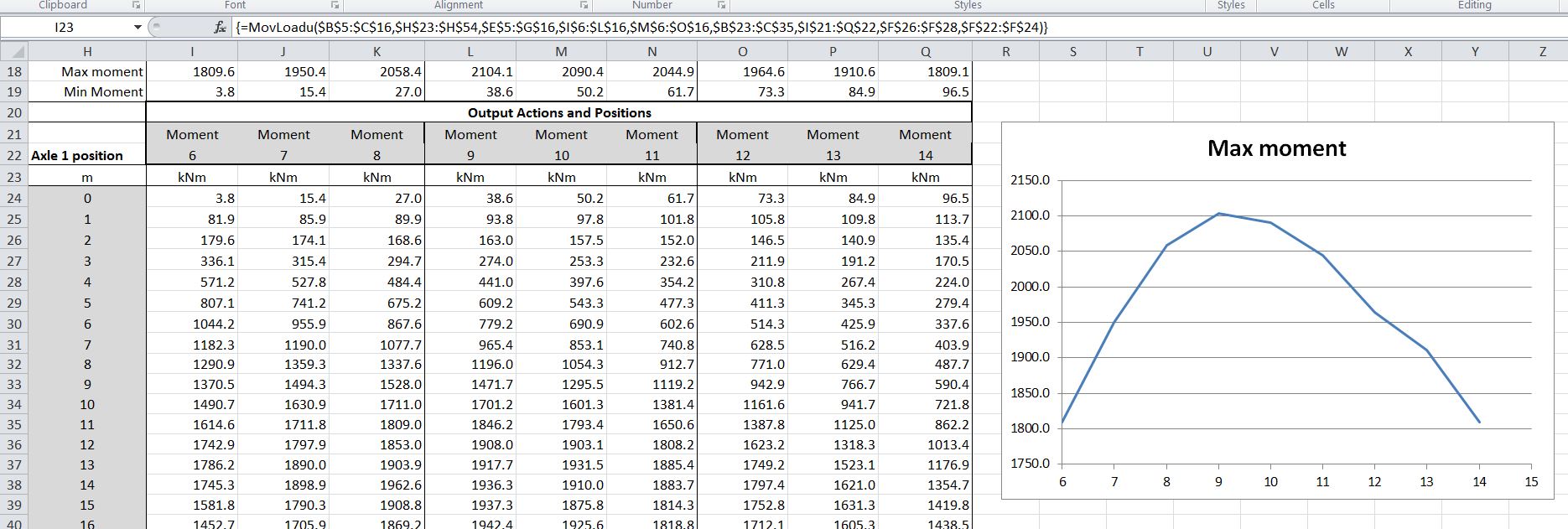 • For each point where the effect of the moving load is to be analysed, enter in a 2 row range the output required (one of “moment”, “shear”, “slope” or “deflection”), and the position of the point, as shown in cells I21:Q22 in the screen shot below.