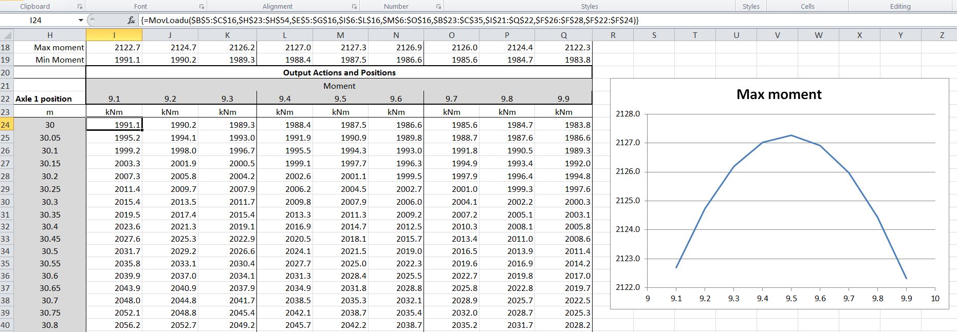 • The MovLoadU function will return the selected output actions for each vehicle position listed.  The function can either be used with the ranges selected in the example, or re-entered (as an array function) anywhere in the spreadsheet.