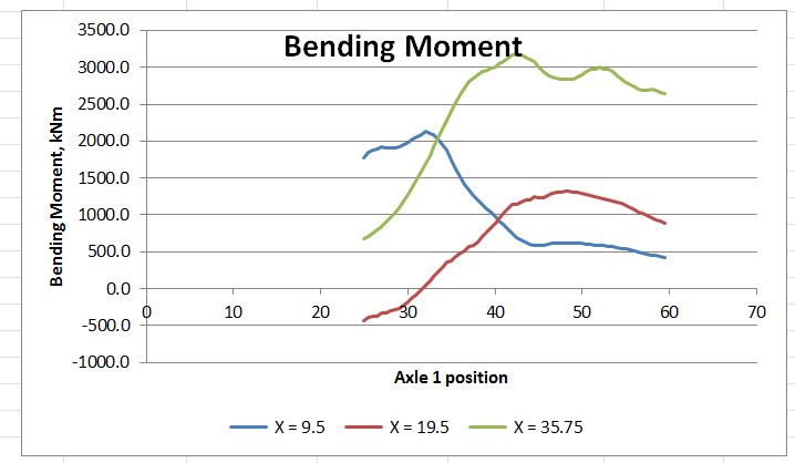 After using the Excel Solver to locate the position of maximum moments, shears and deflections at the 9 locations shown above, the resulting output of actions and deflections can be plotted against vehicle position, as shown below: