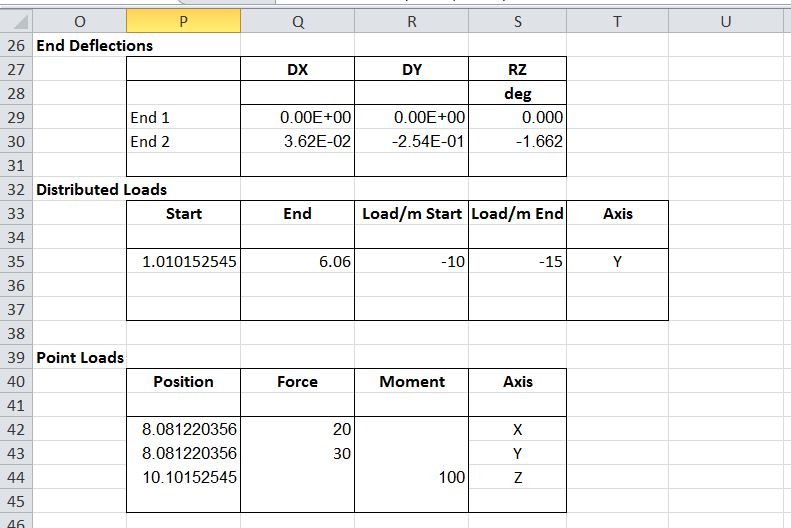 The examples below show input for a uniform beam, but the beam may be subdivided into any number of segments with differing section properties. The current version of the functions performs linear analysis only, but the section properties can be easily adjusted on the spreadsheet, based on the output actions, to provide non-linear materials analysis. Later versions will have this functionality built-in, and will also provide for geometric non-linear effects.