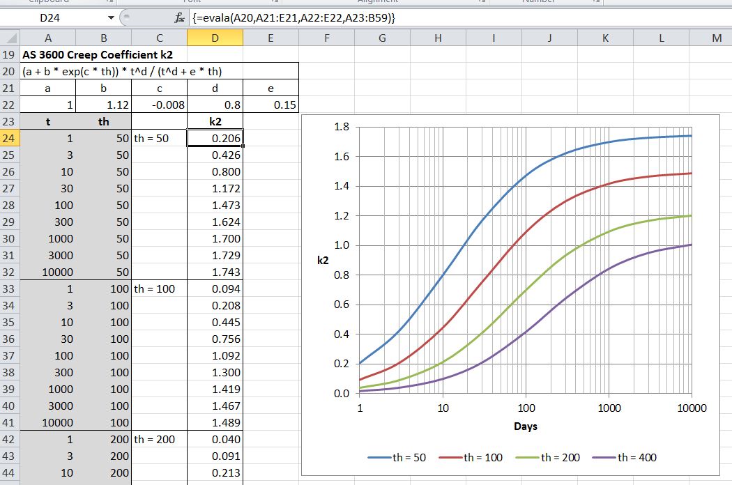 The Evala function returns an array of values with evaluation of a single formula. In the example below the formula for K2 is evaluated for a range of values of t and th: