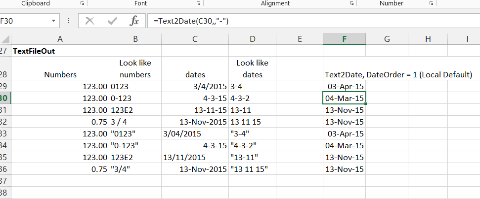 - Text2Date() function to convert any date string into an Excel date value, optionally with a specified day/month/year sequence.