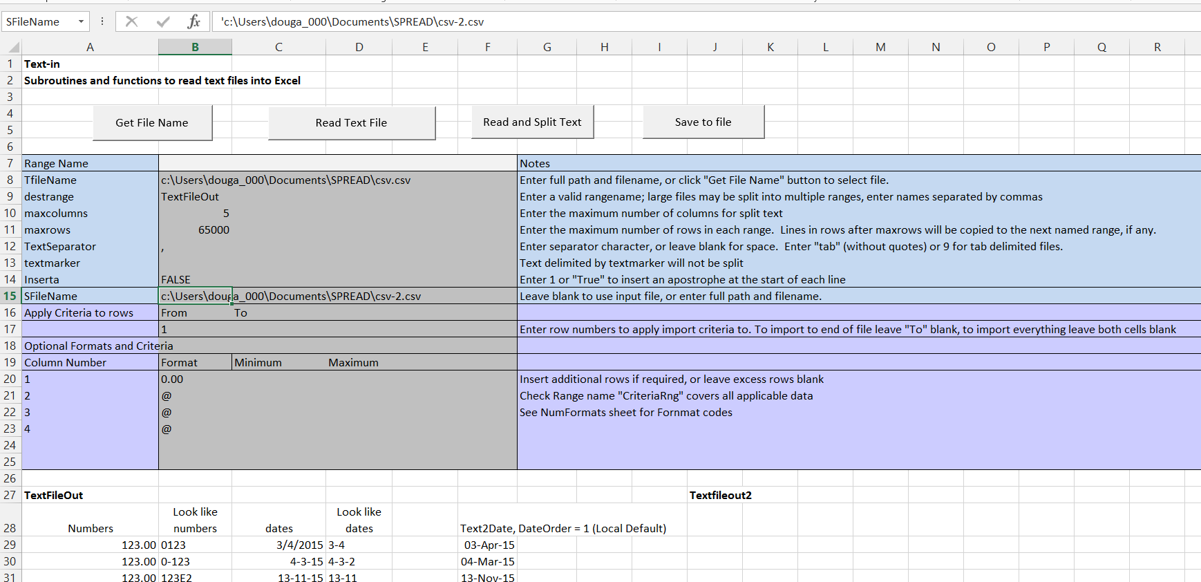 This post makes use of a spreadsheet for reading data from text files, including comma separated value (csv) files. The latest version includes a routine for saving the imported data in csv format. It can be downloaded (including full open-source code) from Text-in2.zip.