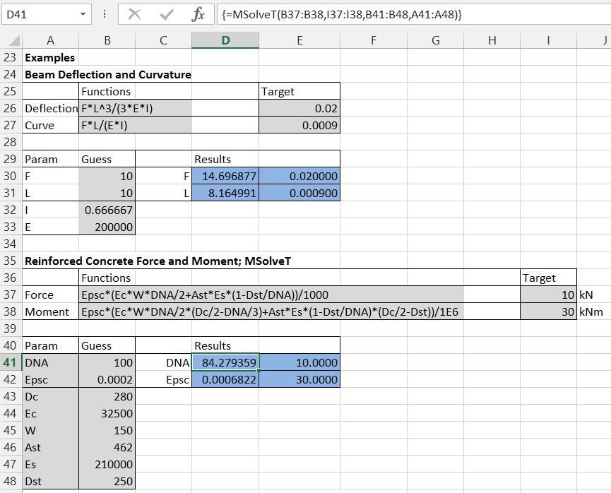 In the example below the VBA function used, RCForceM, allows for the calculation of two layers of reinforcement, and also checks if the compression reinforcement is actually in the compression zone.