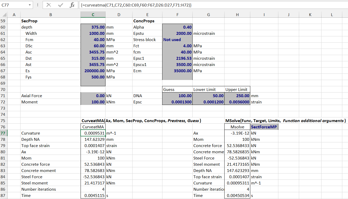 The MomCurveTS function uses the function CurveMA to find the section curvature at just above the cracking moment. It then increases the compressive face strain in equal increments and returns the associated moment and curvature. CurveMA uses the Function MSolve to find the compressive face strain and depth of Neutral Axis for any combination of axial load and bending moment (within the section capacity), and these functions may be called directly from the spreadsheet as shown below: