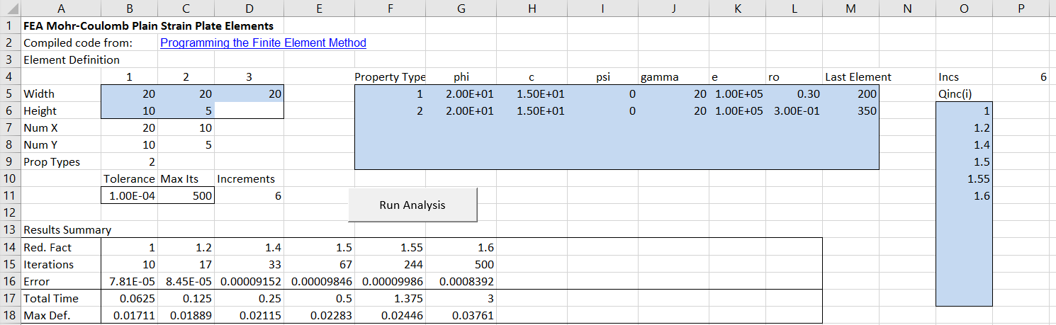 The spreadsheet presented in the previous post takes about 90 seconds to complete (with the iteration limit set at 500) on my computer, and is much slower on some other systems.  The VBA code that does all the hard work is based on Fortran code published in  Programming the Finite Element Method, 5th ed. John Wiley & Sons, I.M. Smith, D.V. Griffiths and L. Margetts (2014), so I have now linked the spreadsheet input to a modified version of the compiled Fortran code.