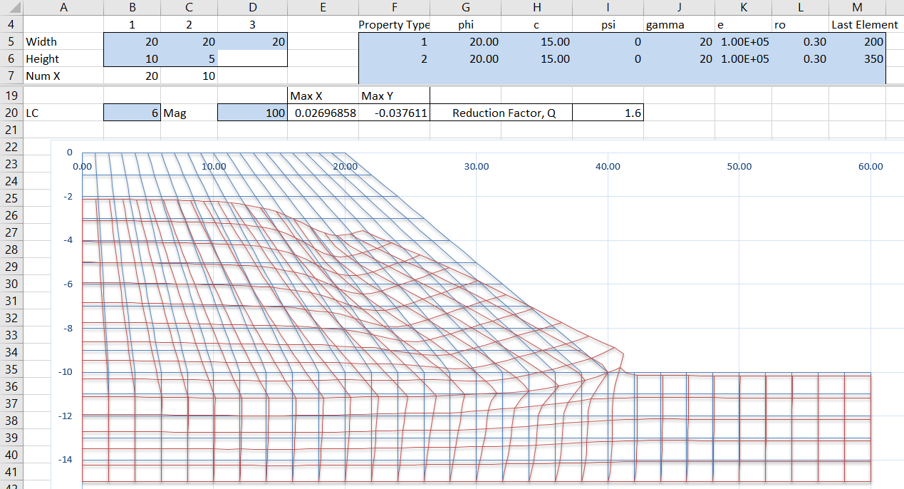 The spreadsheet input is the same as the previous version, except that elements allocated with each soil property type are now specified in the property table.  The elements are numbered from left to right, and top to bottom, so the input in the screen shot below shows Property Type 1 allocated to the first 200 elements, forming the soil slope, and Property Type 2 to the remaining 150 elements in the foundation layers.  In this example both of the material types have been allocated the same properties, which are the same as in the previous post.  The number of iterations and element deflections are almost identical to those from the VBA code.  The reported residual error and maximum deflection values are calculated differently in the new code, so the reported values are different, but they represent the same deflected state in the soil.