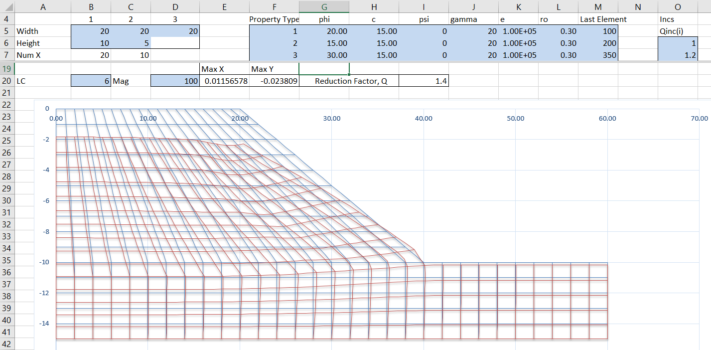 The spreadsheet input is the same as the previous version, except that elements allocated with each soil property type are now specified in the property table.  The elements are numbered from left to right, and top to bottom, so the input in the screen shot below shows Property Type 1 allocated to the first 200 elements, forming the soil slope, and Property Type 2 to the remaining 150 elements in the foundation layers.  In this example both of the material types have been allocated the same properties, which are the same as in the previous post.  The number of iterations and element deflections are almost identical to those from the VBA code.  The reported residual error and maximum deflection values are calculated differently in the new code, so the reported values are different, but they represent the same deflected state in the soil.