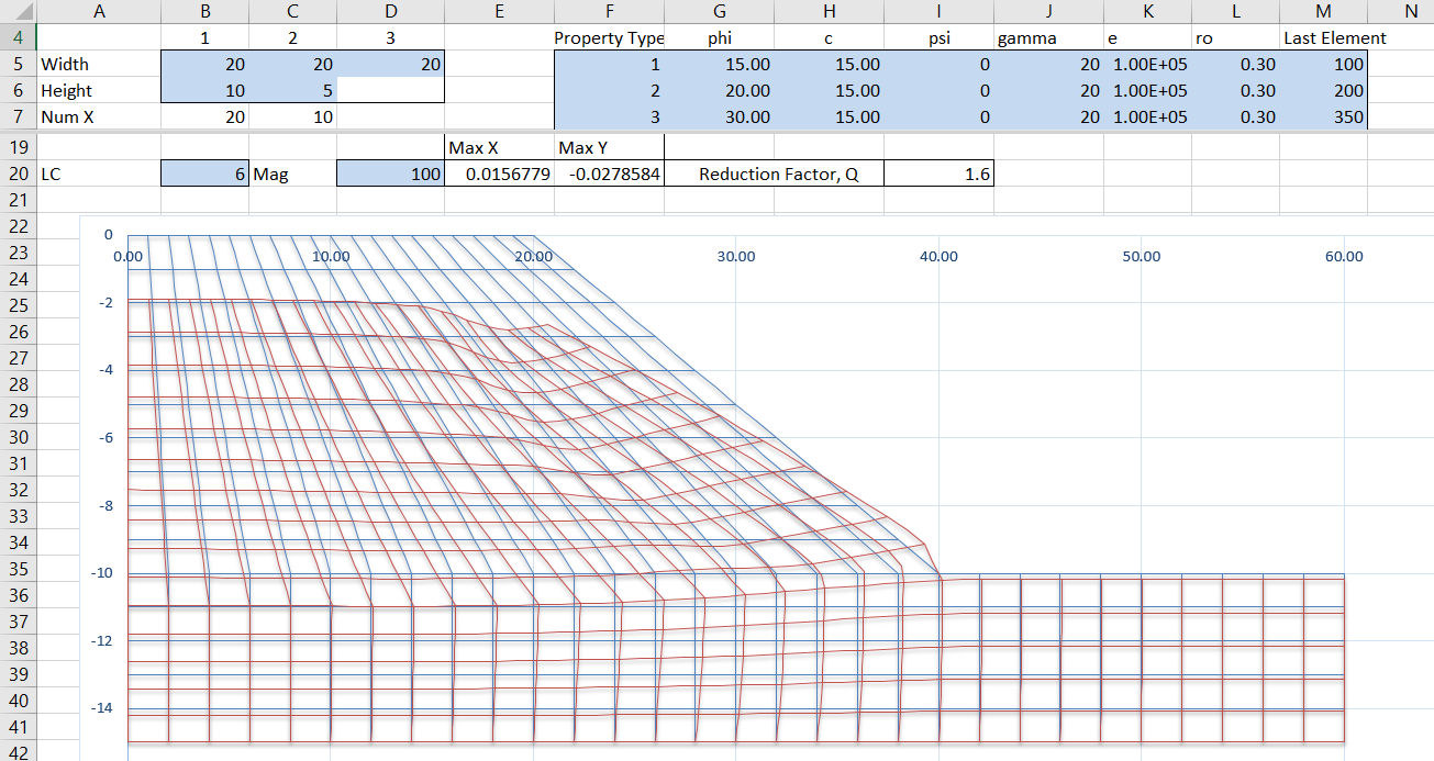 The spreadsheet input is the same as the previous version, except that elements allocated with each soil property type are now specified in the property table.  The elements are numbered from left to right, and top to bottom, so the input in the screen shot below shows Property Type 1 allocated to the first 200 elements, forming the soil slope, and Property Type 2 to the remaining 150 elements in the foundation layers.  In this example both of the material types have been allocated the same properties, which are the same as in the previous post.  The number of iterations and element deflections are almost identical to those from the VBA code.  The reported residual error and maximum deflection values are calculated differently in the new code, so the reported values are different, but they represent the same deflected state in the soil.