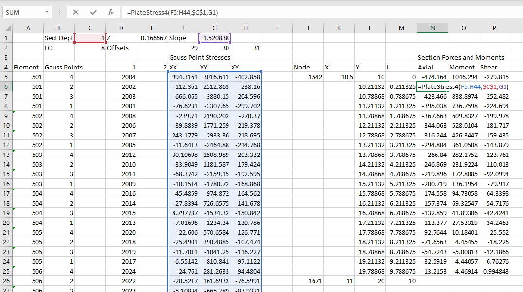 - Use the PlateStress4 function to calculate the axial force, bending moment, and shear force for each of the selected plates (see previous post)