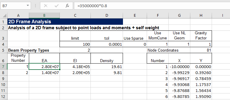 The Python/Fortran/Excel frame analysis program (previous version here) now has several new features added to the 2D-solver routines: