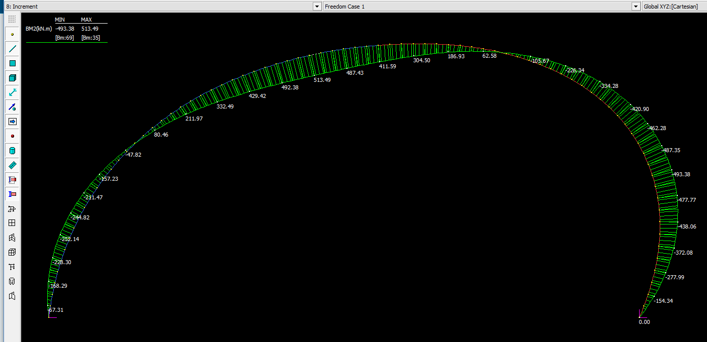 The arch shown below was also analysed in Strand7, using the same moment-curvature tables, and with the non-linear geometry option also selected: