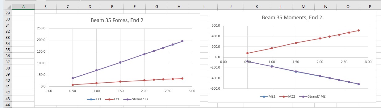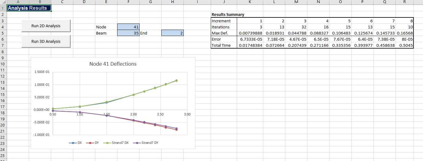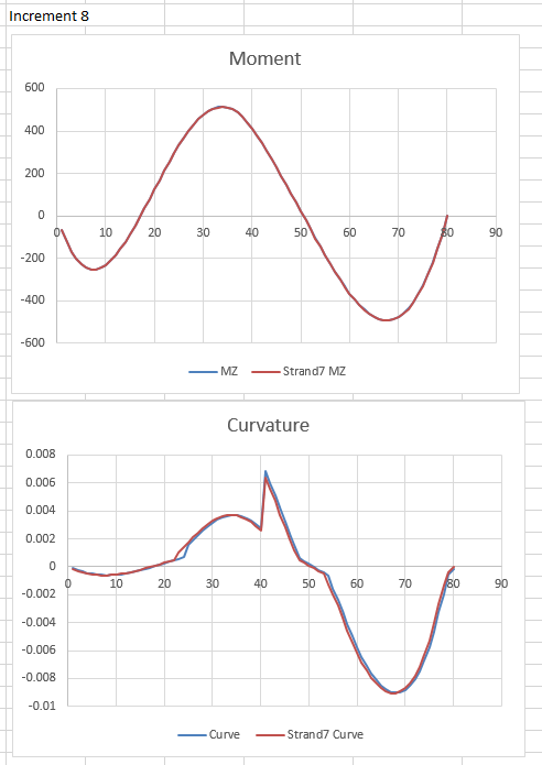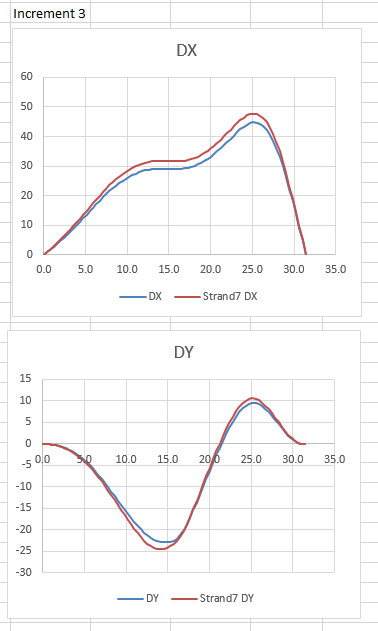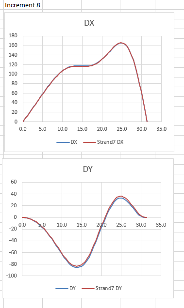 On the “Deflect” sheet graphs have been added to show X and Y deflections for any chosen load increment, showing both spreadsheet and Strand7 results. Note that at moments just above the concrete cracking moment there are differences between the spreadsheet and Strand7 interpolation methods, resulting in noticeably different deflections: