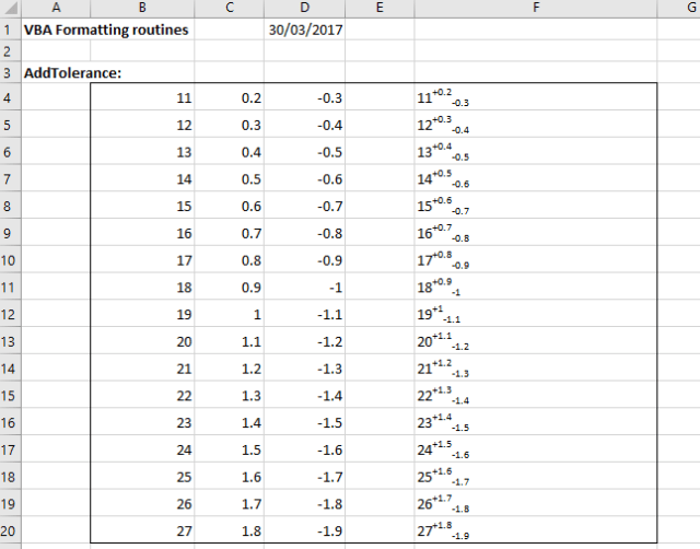 The data consists of three adjacent columns: values and upper and lower tolerances. To run the macro either select just the input data range, or extend the range to the right, then press Alt-F8 and select AddTolerance. The output results will either be written to the column to the right of the input data, or if a wider range was selected, in the last column of the selected range, as shown above.
