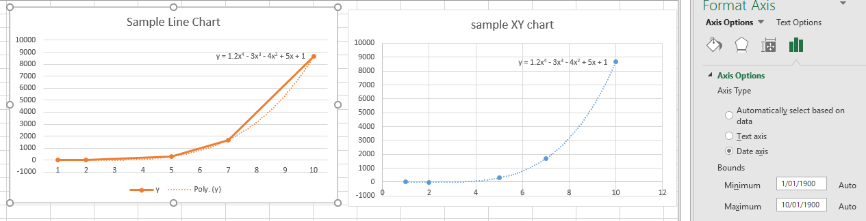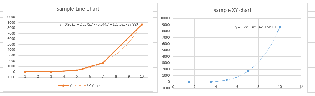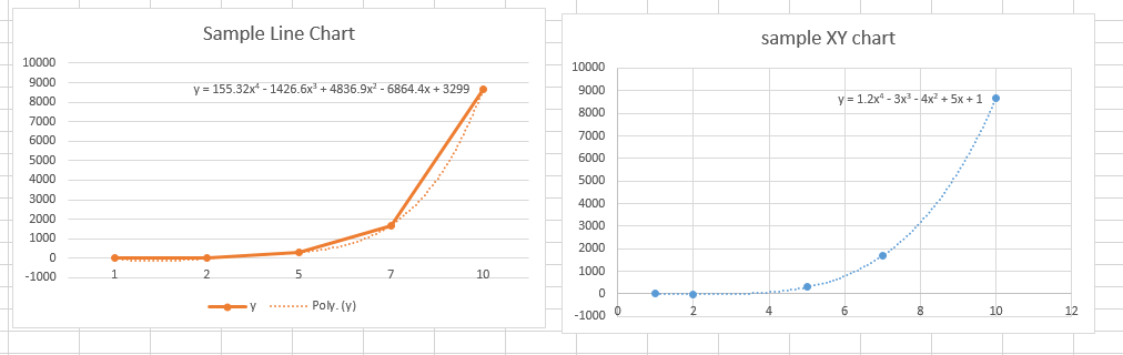In the previous post we saw that if a trend line equation is added to a line chart it will return the wrong coefficients if the x values are not a continuous sequence of integers, starting at 1 (click on any image for full size view):