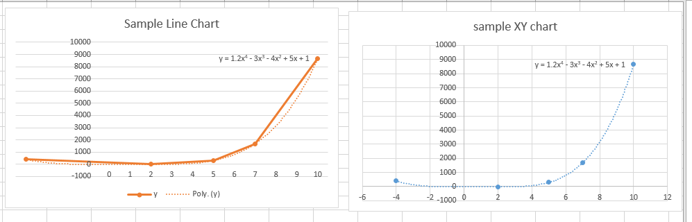 The trend line will also still work correctly if there are one or more negative x values (although the values do not display in the axis labels):