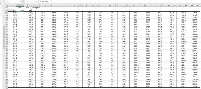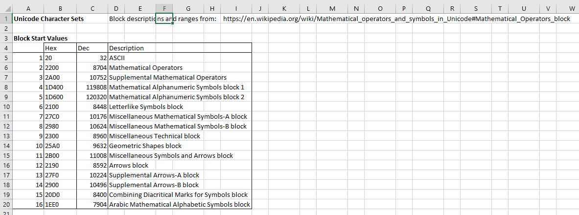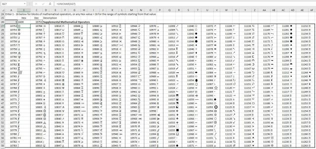The Unichar function was introduced in Excel 2013. This function returns the Unicode symbol for any given decimal code value. In the Unicode spreadsheet I have used this function to generate a table of values and symbols for any of the lists of mathematical operators and symbols given by Wikipedia at Mathematical Unicode Symbols.
