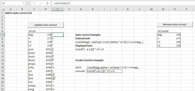 This UDF of course only works in the Unicode spreadsheet (or if the function VBA code is copied to another spreadsheet). Note that the UDF does not use the Excel Auto-correct list, it uses the UCList range on the spreadsheet. If you don’t want to change the Auto-correct list, the UDF will still work.