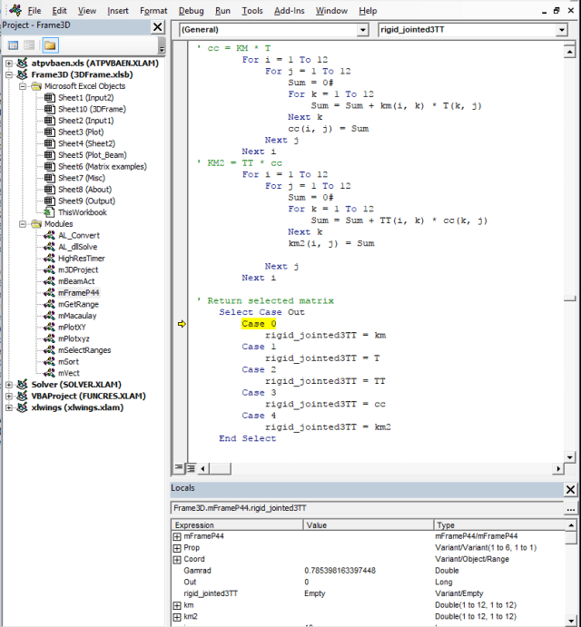 Following a recent comment this post looks at the code for setting up the stiffness matrix for a 3D frame, and how to step through any selected part of the code.
