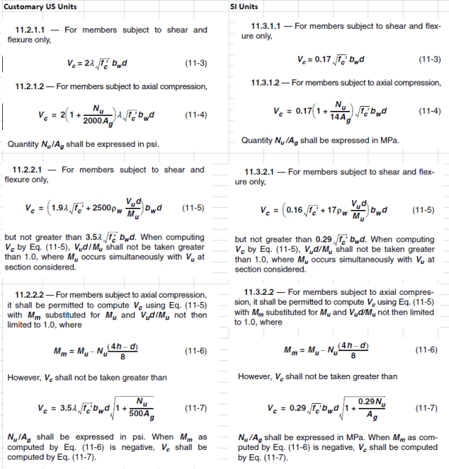Finally the upper limit to the shear force for combined axial load and shear is found with formula 11-7. Note that in this case the final expressions in the formula have a different form in the two versions of the code (1 + Nu/(500*Ag) for the US units version and 1 + 0.29*Nu/Ag for the SI version). Both have been converted to the form 1 + Nu/(Kc2*Ag), so Kc2 can have units of stress, so for the SI version the value of Kc2 becomes 1/0.29: