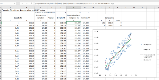 The AL-Spline-Matrix spreadsheet contains a large number of VBA user defined functions (UDFs) performing spline fitting and matrix operations, using the free and open source ALGLIB library. It was recently pointed out that the Excel interface code for the CSplineFitCW1da function had an error. The function fits a cubic spline to scattered data, with provision for weighting and specified constraints, but the code error resulted in the constraints not working properly. The code has now been fixed, and an example with constrained data is shown below.