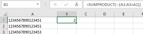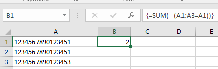 But if we enter three text strings with 16 or more numerical characters, that are only different in the 16th or later characters, COUNTIF will say they are all the same:
