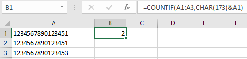 CHAR(173) is a “soft hyphen” character, which will ensure that the contents of the data range are treated as text strings, rather than numbers, but is otherwise ignored. Now all numeric text strings of any length may be entered, and they will only be counted as being the same if they really are.