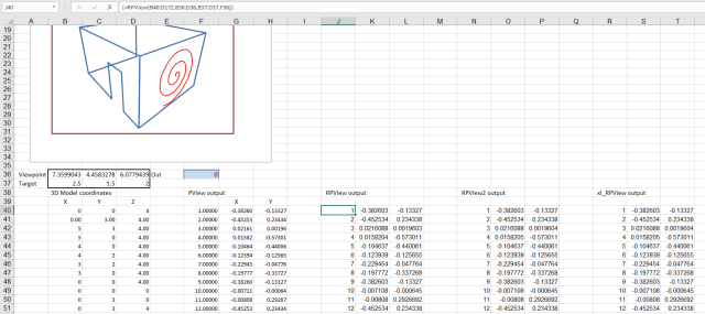 The code described in the previous post includes a Python function that rotates 3D coordinates by an angle defined with two vectors, using Rodrigue’s Rotation. I have now added this function to the IP2_py spreadsheet, where it is used in the original application (fitting a circular arc to 3D data points), and also in the PView user defined function (UDF), to generate a perspective projection of any 3D framework. The new spreadsheet and associated Python code may be downloaded from: