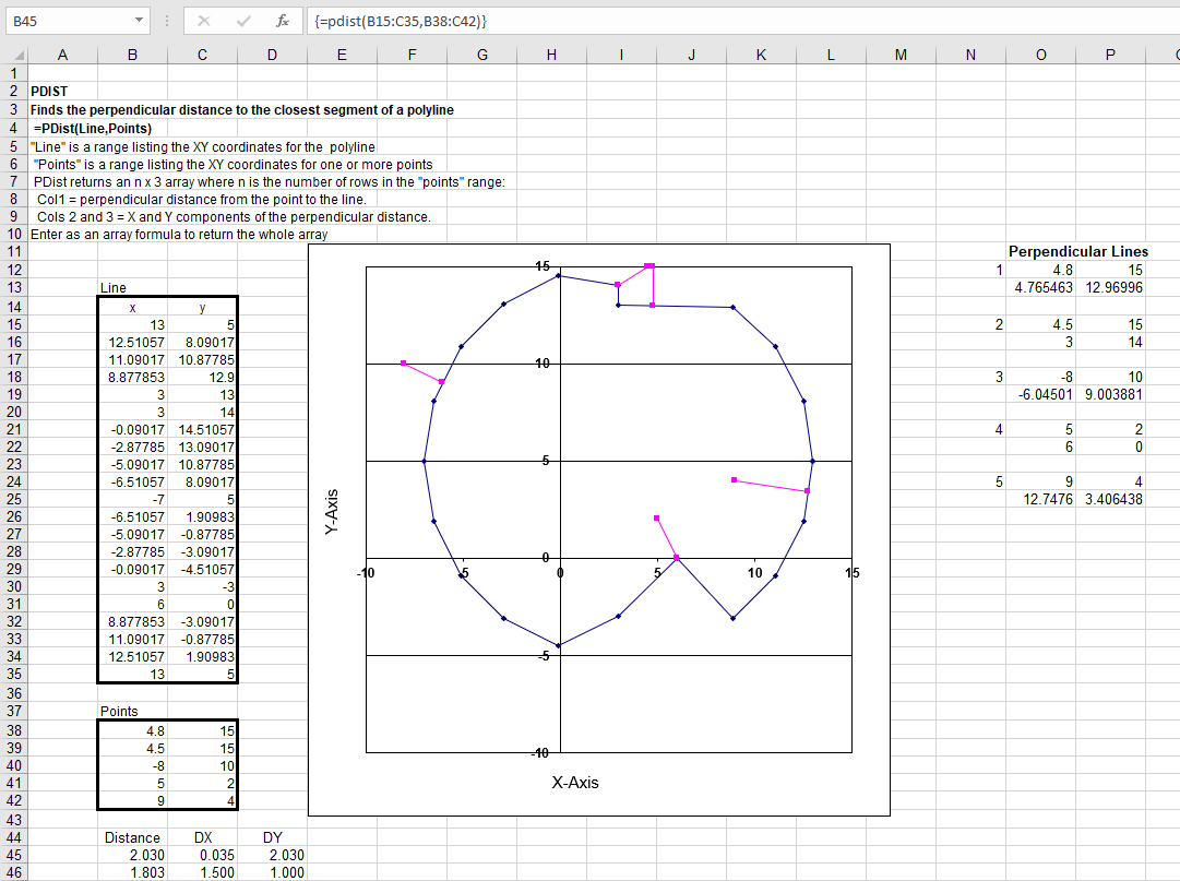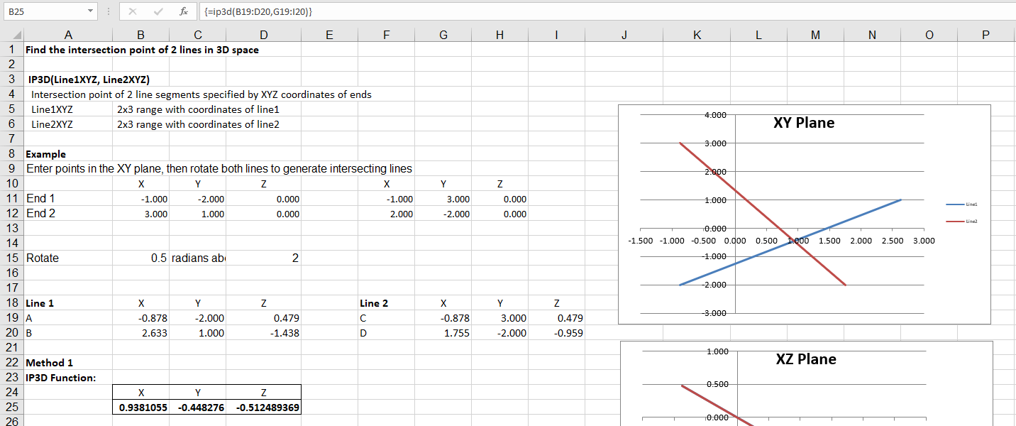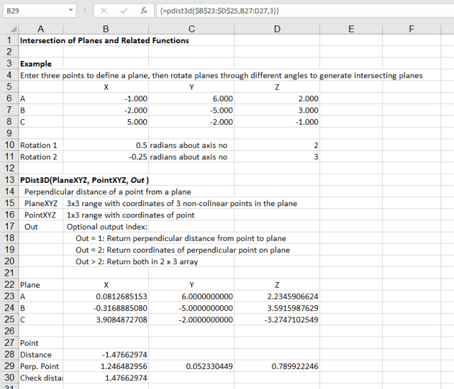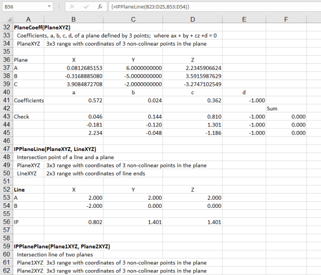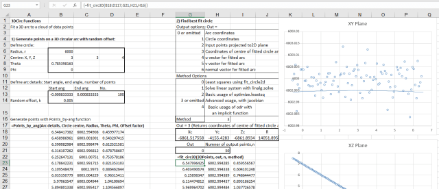 The spreadsheet IP2_py provides a large number of geometric functions, including intersection points of lines, circles and planes, interpolation, rotations, and converting between coordinate systems. Many of the functions are available in VBA and Python versions. The Python code has now been updated to work with Python 3. The updated files can be downloaded from: