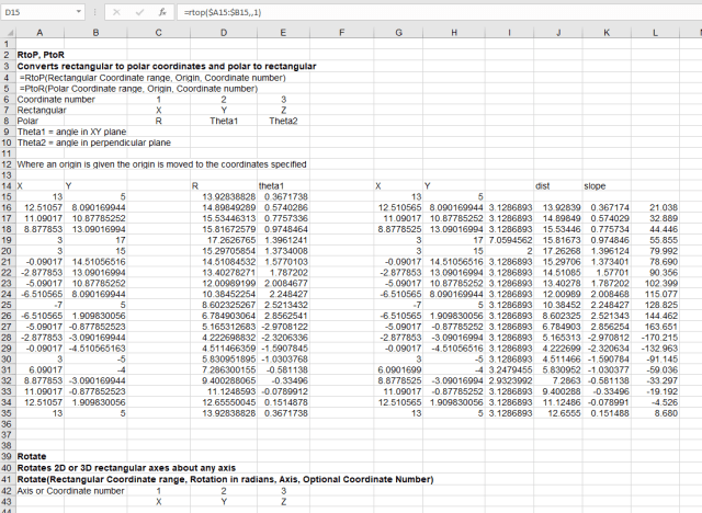 RtoP and PtoR convert coordinates between rectangular and polar systems. Rotate returns coordinates of one or more points, rotated about a specified axis: