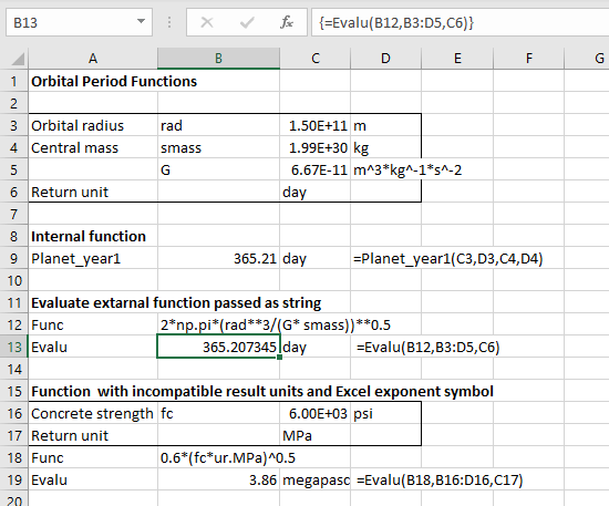As before, the Excel exponentiation symbol may be used both in functions to be evaluated and in unit names, and is converted automatically to the Python **.