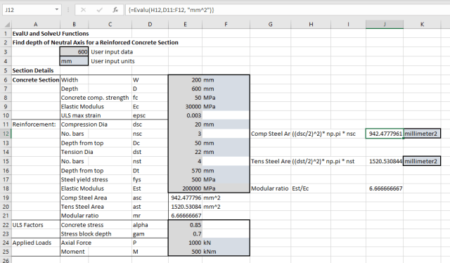 Following the previous post I have adapted the units code to use the Pint package, and added a function using the Sympy equation solver, with Pint units. I have applied the functions to finding the depth of neutral axis of a reinforced concrete beam, under combined bending and axial load. A similar example was previously presented using VBA code.