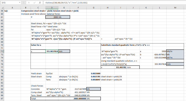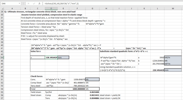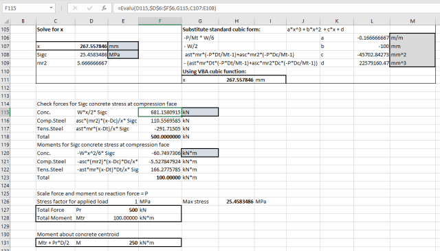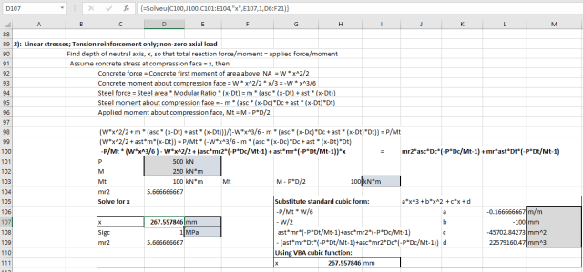 In the example below the cubic equation for the neutral axis depth is solved using the SolveU function, and compared with the results using the VBA Cubic UDF:
