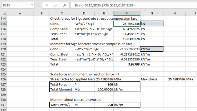 Finally the compression stress is scaled to generate a reaction force equal to the applied load of 500 kN (25. 46 MPa), and the internal moment about the concrete centroid is checked against the applied moment. The calculated stress may then be copied to the Sigc value (cell D108), to find the actual forces and moments in the steel and concrete under the applied load: