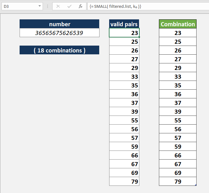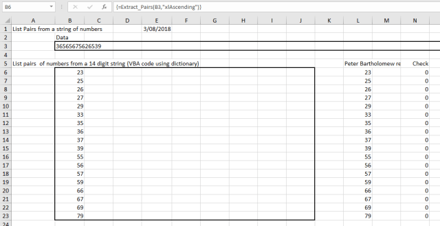 Hui’s original VBA code returned all different 2 digit numbers, for instance both 23 and 32. I have modified it to return only the lower value when two values have the same two digits, to be consistent with Peter Bartholomew’s results: