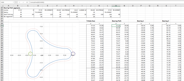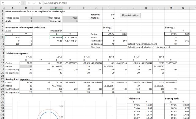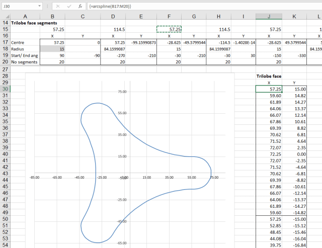 As an example of the use of the new functions, in conjunction with the IP (intersection) function, I have generated an animation showing the movement of two circular bearings, relative to a rotating tri-lobed shaft. The tri-lobe is generated using the ArcSpline function, by defining the centre, radius, start and end angles, and number of segments for each of the six arcs: