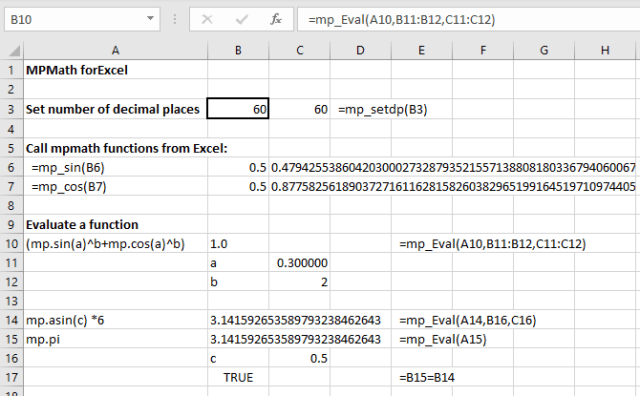 The mp_sin and mp_cos functions illustrate how any mpmath function may be called from Excel. Note that: