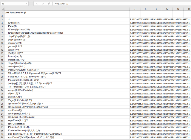 As an alternative to creating an interface function for each mpmath function, the function may be entered on the spreadsheet and evaluated to mpmath precision using the mp_Eval function.