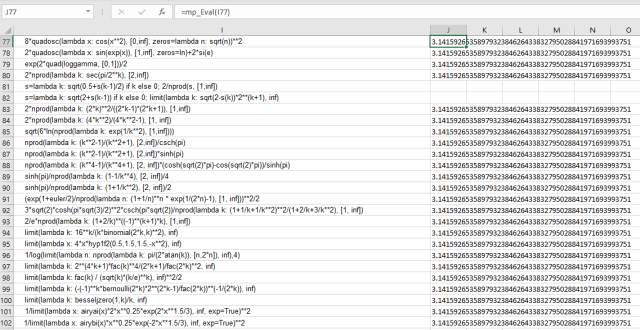 As can be seen below, all but 2 of the functions evaluate to pi, to 60 decimal places (click on any image for full-size view). The two functions that did not evaluate included the statement “if k else 0” in the lambda expressions.