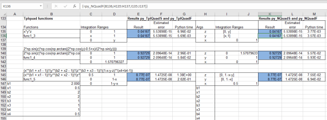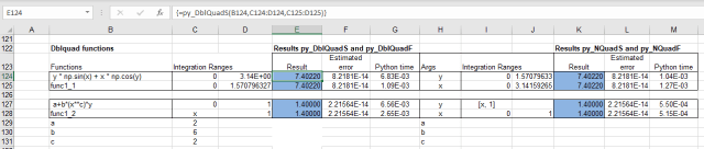 Each of the Python functions can be called to evaluate the integrals of either a function entered as a string on the spreadsheet (py_DblQuadS, py_TplQuadS, or py_NQuadS), or a Python function (py_DblQuadF, py_TplQuadF, or py_NQuadF).