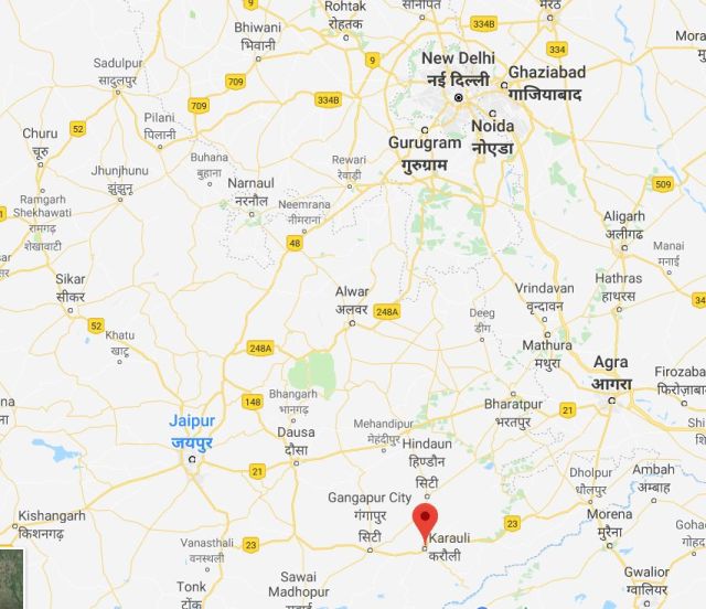 The small city (by Indian standards) of Karauli lies to the South-East of Agra in the state of Rajasthan. The city contains a royal palace, parts dating back to the 14th Century, which despite not getting a mention in Wikipedia, is well worth a visit: