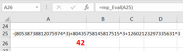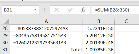 If we try to check this result in Excel we find that the available 15 significant figure accuracy is not quite up to the job: