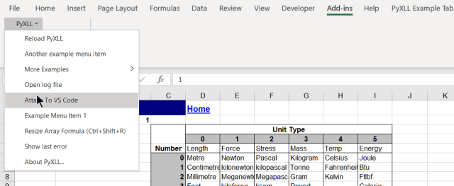 4. Go to the Excel File that will be calling the Python functions, and link to the editor from the Add-ins – Pyxll – Attach to VS Code menu: