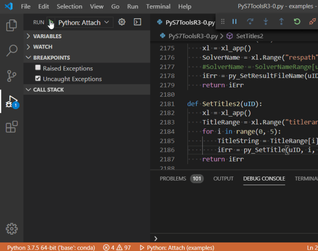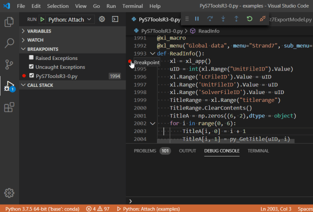 Setting up your editor to allow Python code debugging for functions called from Excel can be tricky, depending on the details of your editor and linking software, but using the Visual Studio Code Editor and Pyxll, this works for me: