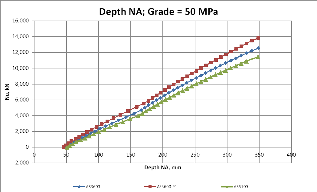 - A rectangular stress block equivalent to the Eurocode 2 parabolic-rectangular stress block (labelled AS 3600-P2 in the graphs below).