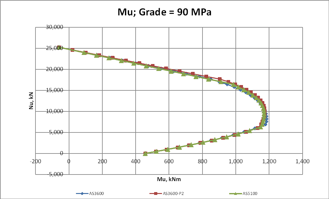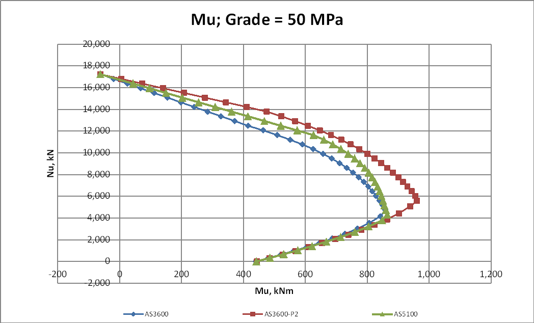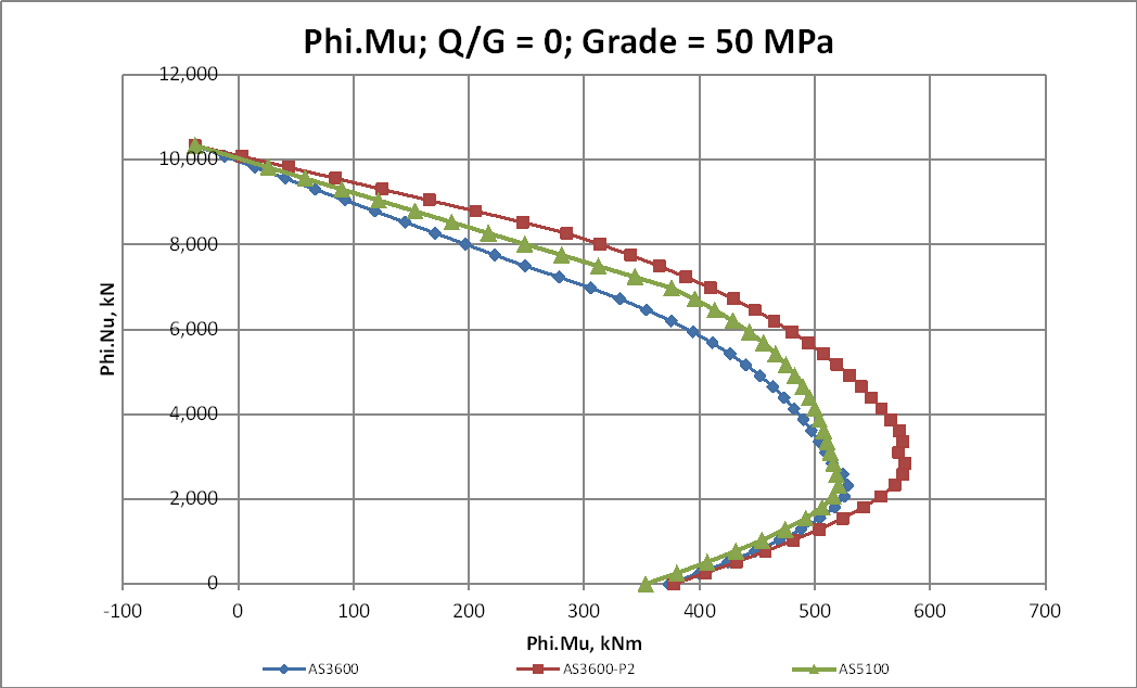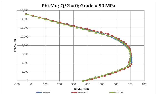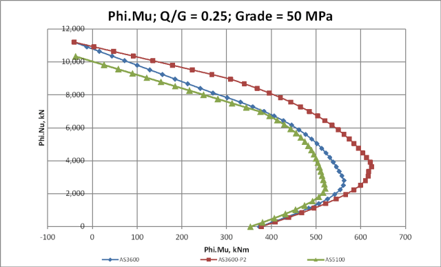 For a Q/G of 0.25 or greater the increased Phi factor makes the new AS 3600 results greater than AS 5100 over the full range. The P2 results are equal to AS 3600 for low axial loads, and significantly higher at mid to high axial loads: