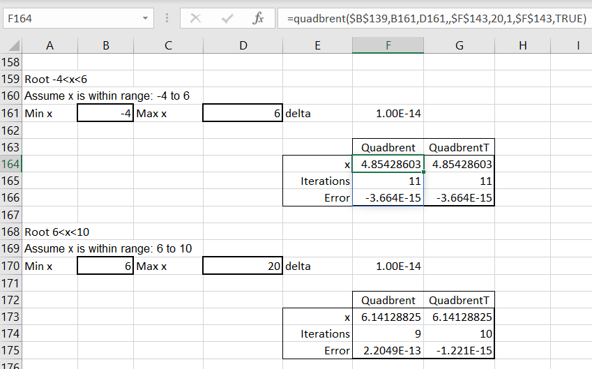 - The Quadbrent function works with functions entered as text on the spreadsheet as shown, or (by default) will call a named VBA function. The QuadbrentT function is a front-end for Quadbrent with defaults set to use text on the spreadsheet, as shown above.