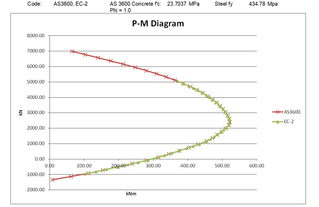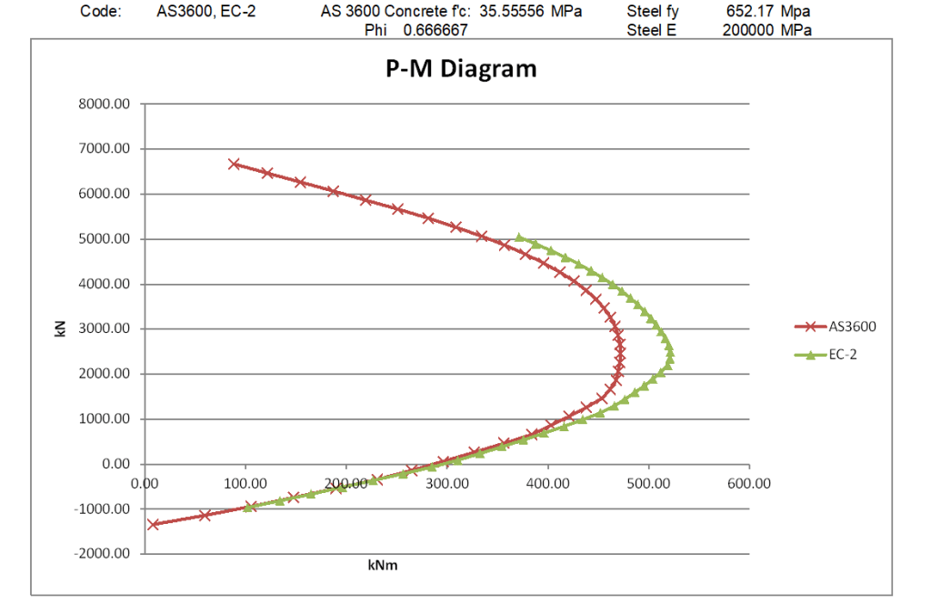 However if in AS 3600 the global reduction factor is set to 1/1.5, with the steel yield strength factored by 1.5/1.15, and the concrete strength factored by 1/0.9, so the nett material properties after factoring are the same as in the Eurocode analysis, the results are different: