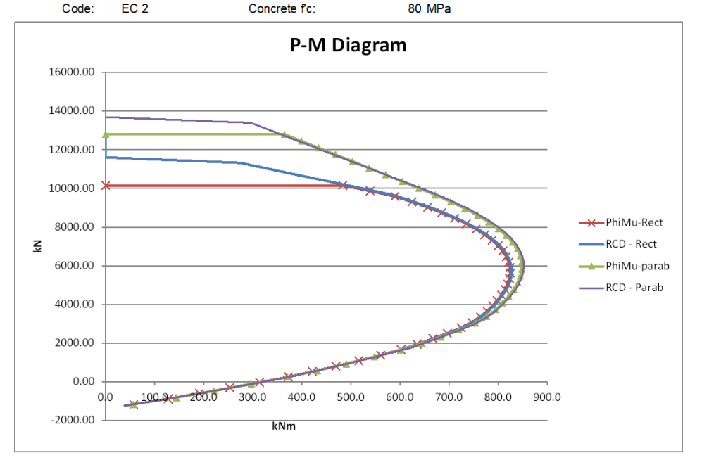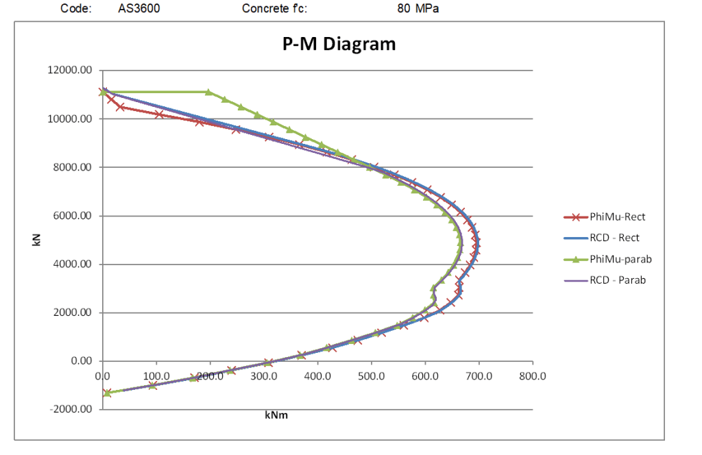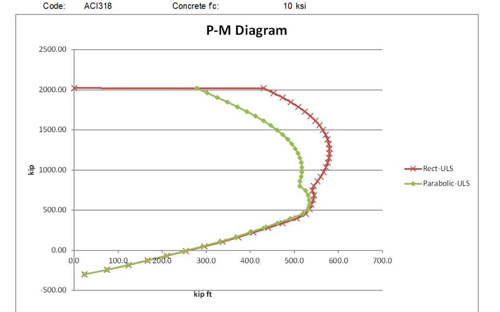For the lower strength concrete the rectangular stress block moment capacities are significantly higher than the parabolic stress block for all axial load greater than the balance load, and for higher strength concrete the difference increases to almost a 50% increase at loads close to the maximum axial load.
